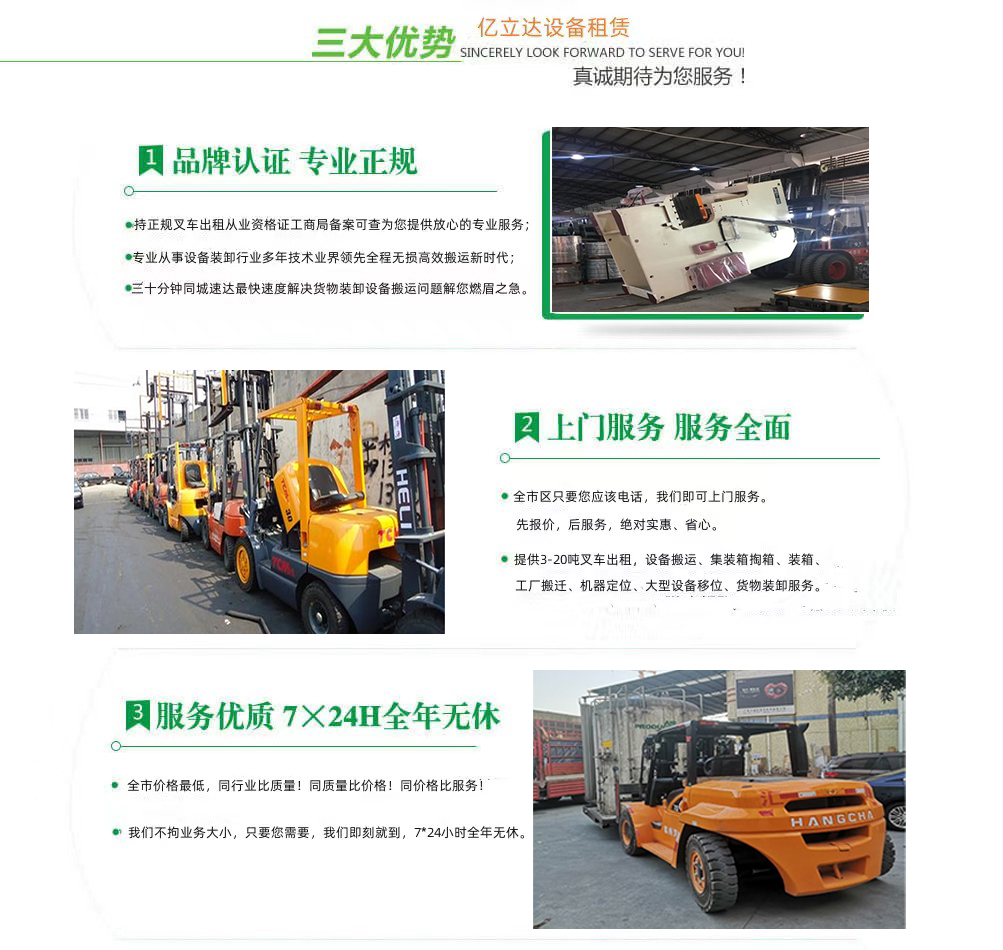 亿立达设备租赁有限公司是工商局准许的北京舞蹈学院专业叉车出租公司,公司本着诚信、服务、效率、创新的经营理念,用精湛的技术,真诚的服务,为众多客户提供优质的服务,同时获得信赖与支持。专业提供北京舞蹈学院3-20吨叉车出租、叉车租赁、设备搬运、集装箱掏箱装箱、机器移位定位、货物装卸、工厂搬迁、安全可靠,收费透明,价格便宜,随叫随到,24小时上门服务!本公司叉车吊车师傅对各种设备搬运装卸都有深刻探讨和研究。很多的疑难设备搬运,通过我公司的叉车师傅都能迎刃而解。对各种进口设备、国产机器、大型设备搬迁、高难度搬迁、各种精密仪器、医疗设备、科研设备等都能搬运; 提供全市 24 小时上门装卸搬运服务。同时提供厂房搬迁服务。 ...